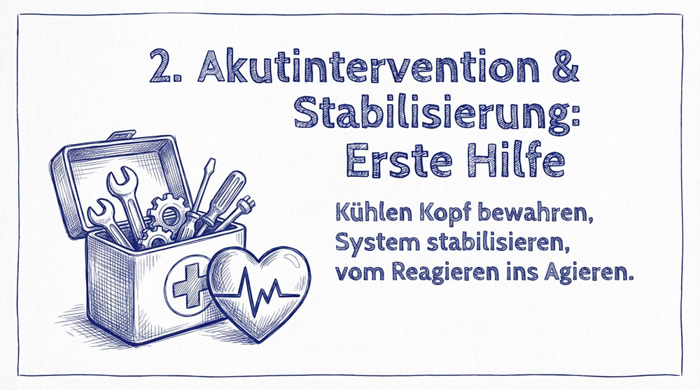 In unserem letzten Artikel haben wir darüber gesprochen, wie man die leisen Risse im Fundament erkennt, bevor der Damm bricht. Aber was tun, wenn das Wasser bereits über die Ufer tritt? In dieser Phase der akuten Intervention geht es nicht um langfristige Strategien, sondern um effektive Erste Hilfe. Es geht darum, vom panischen Reagieren ins kontrollierte Agieren zu kommen.